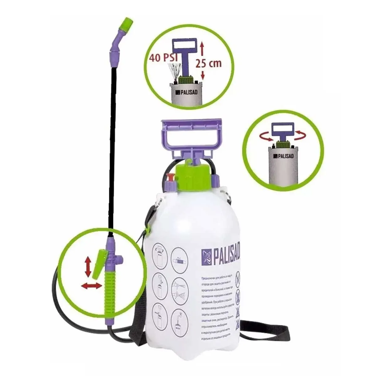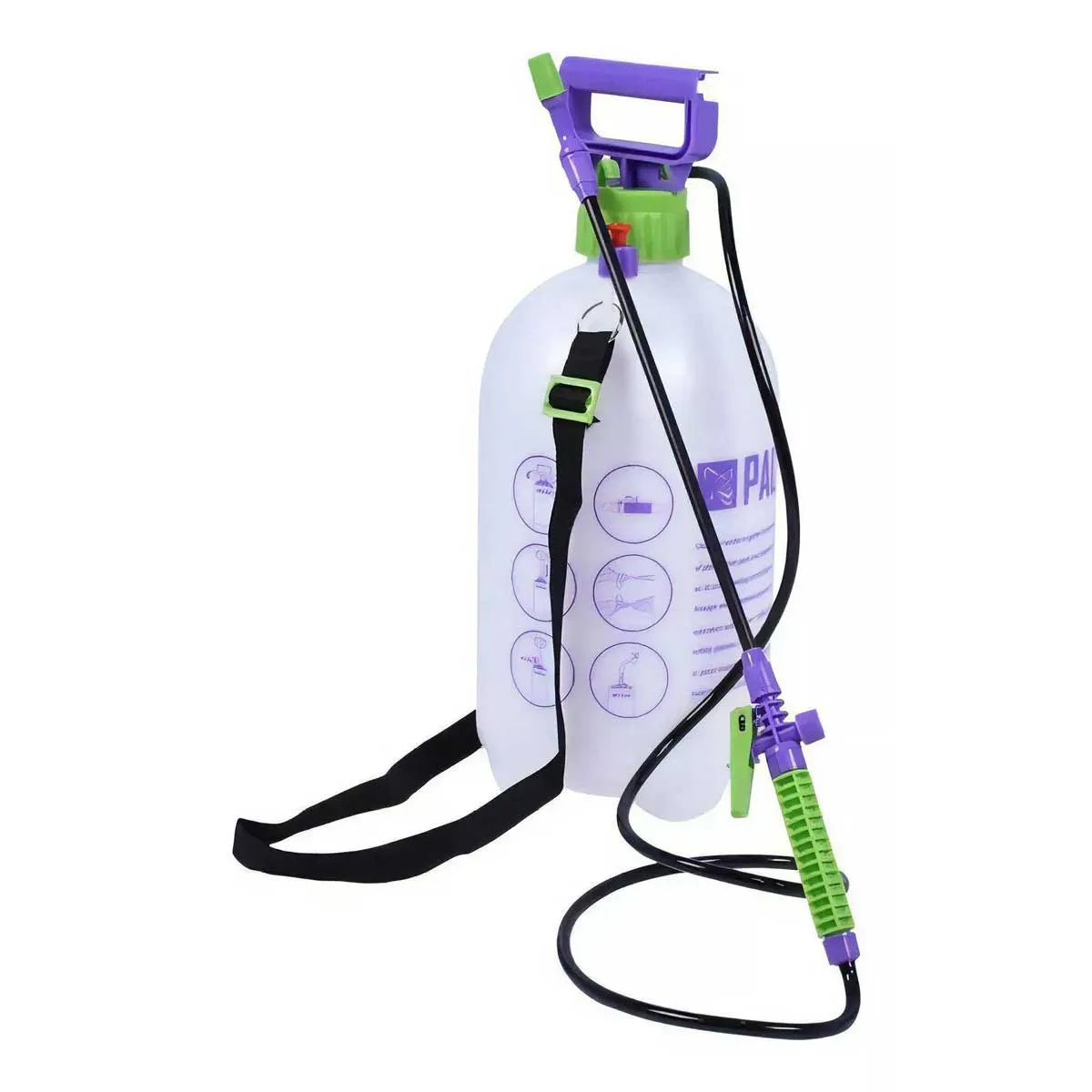 Pulverizador manual 7L, frasco com uma escala de medição, uma bomba para criar pressão e válvula de controle de pressão automático, além de possuir cabeça com ajuste de jato, utilizado em jardim e plantações.