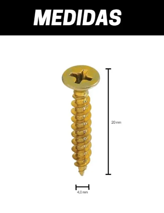Parafuso de 4mm x 20mm com cabeça chata, rosca autotravante e acabamento bicromatizado. Fabricado em aço carbono cementado e temperado, ideal para fixação de objetos leves em madeira, MDF, OSB, drywall e também em paredes com bucha nylon.